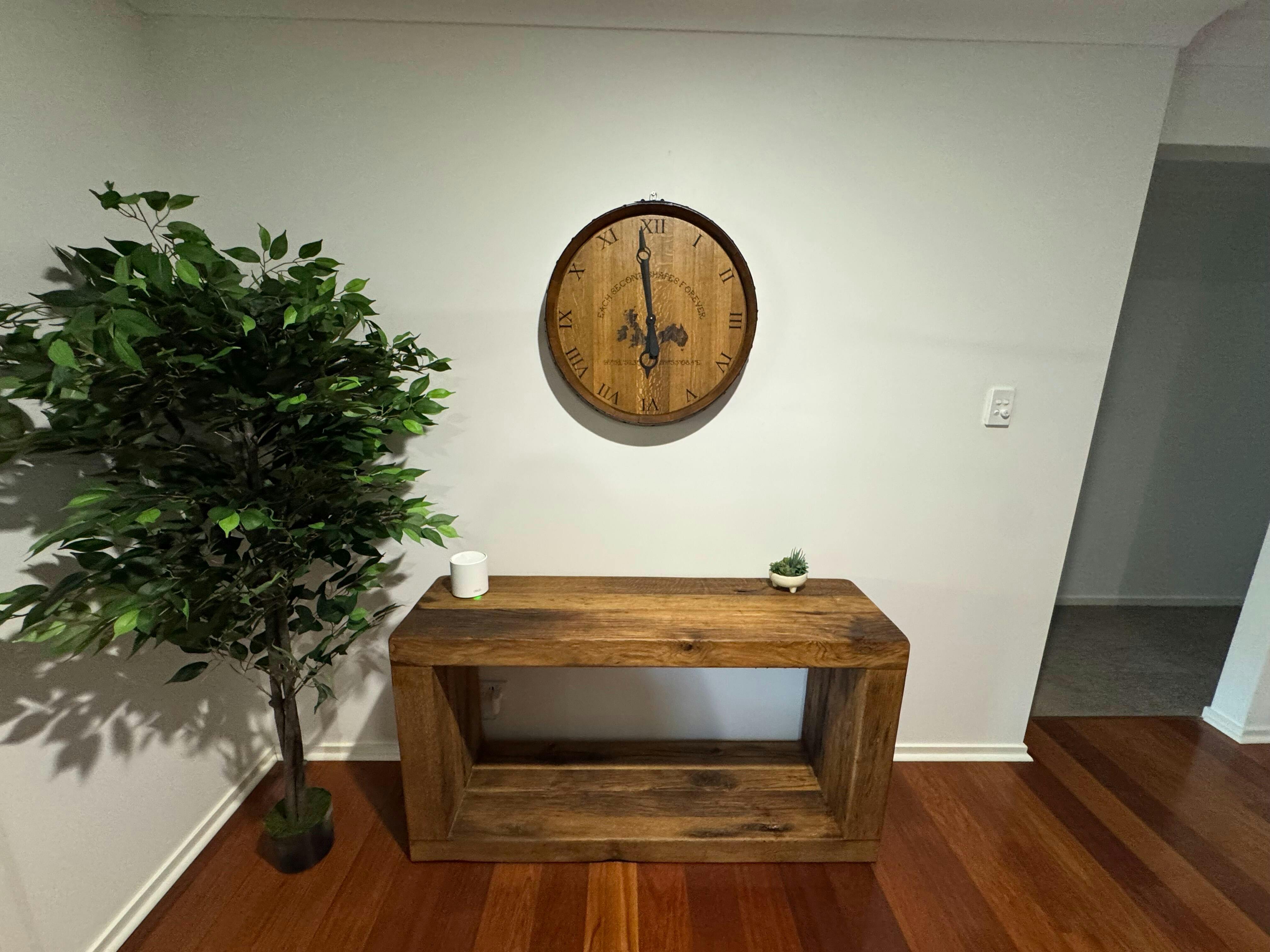 Our 630mm Wine Barrel Head Clock begins its life ageing wine in an Australian working winery before being carefully deconstructed, restored and transformed into a solid oak wall clock.