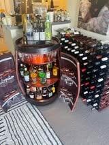 Handcrafted wine barrel mini bar with bottle and glass storage – rustic home bar furniture